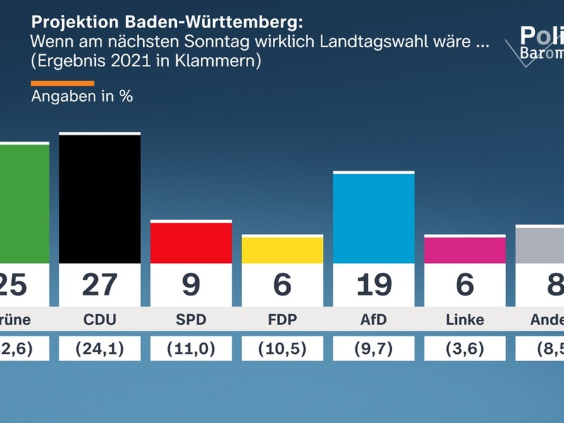 Wenn schon am nächsten Sonntag Landtagswahl wäre, dann ergäben sich folgende Projektionswerte für die Parteien: Die Grünen lägen zurzeit bei 25 Prozent, die CDU käme auf 27 Prozent, die SPD auf 9 Prozent, die FDP auf 6 Prozent, die AfD auf 19 Prozent und die Linke auf 6 Prozent. Die anderen Parteien erhielten zusammen 8 Prozent, darunter keine Partei, die mindestens drei Prozent erzielen würde. Aufgrund dieser Zahlen würde es für eine Regierung aus CDU und Grünen reichen.