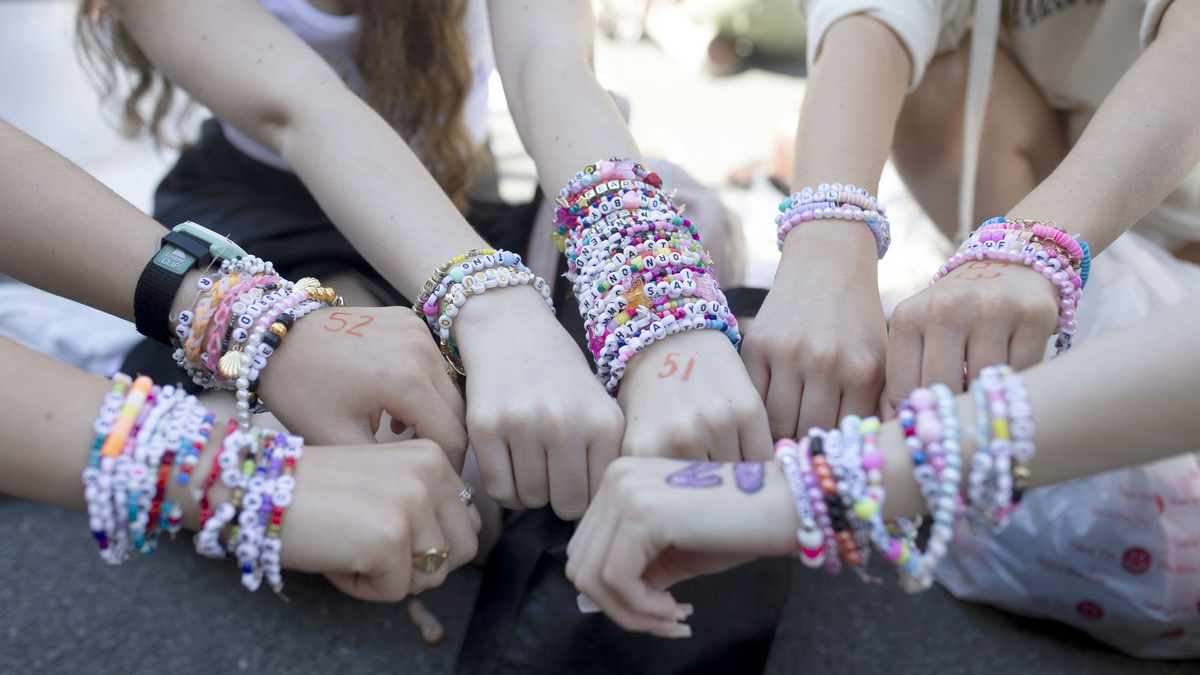 Ihre Fans haben diese Aufforderung wortwörtlich genommen und knüpfen Armbänder, um diese bei Konzerten untereinander zu tauschen. Auf Plattformen wie Tiktok, Instagram und Youtube kursieren aufwendige Anleitungen für Perlenarmbänder im Swift-Design. Es gibt dazu sogar Workshop-Angebote verschiedener Anbieter. In die meisten Armbänder werden mithilfe von Buchstaben-Perlen etwa Songnamen und -texte eingearbeitet.