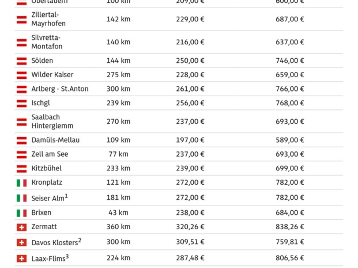 Für eine vierköpfige Musterfamilie (zwei Erwachsene, ein 14-jähriger Jugendlicher und ein zehnjähriges Kind) kostet ein Skitag in fast allen Gebieten außerhalb Deutschlands, Tschechiens und Polens mehr als 200 Euro. Am günstigsten ist Balderschwang mit 118 Euro, am teuersten Zermatt mit rund 320 Euro. Beim 3-Tages-Familienpass überschreiten Zermatt und Laax-Flims sogar die 800-Euro-Marke. In vielen deutschen Skigebieten kostet ein vergleichbarer Familienausflug dagegen weniger als die Hälfte.