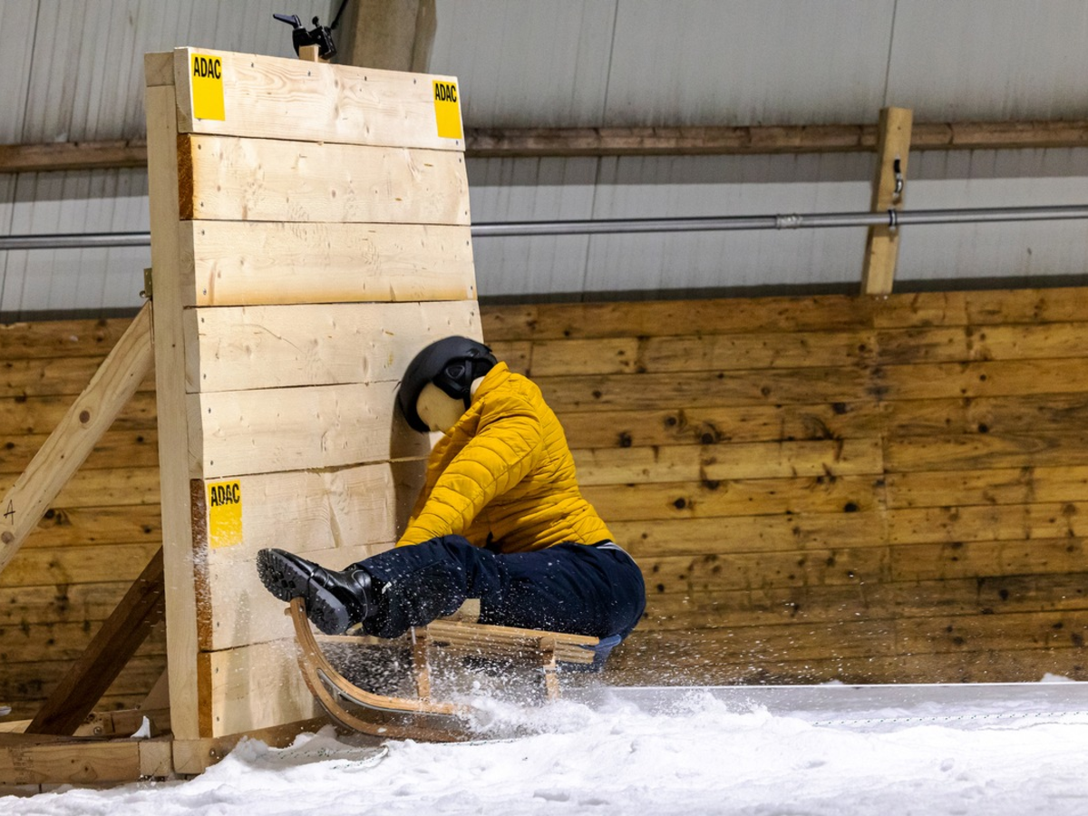 Dass auch beim Schlittenfahren ein Helm lebensgefährliche Verletzungen drastisch reduzieren kann, hat der ADAC in einem Crashtest aufgezeigt. Der Dummy, auf einem Holzschlitten positioniert, fuhr dafür mit 25 km/h gegen eine Holzbarriere.