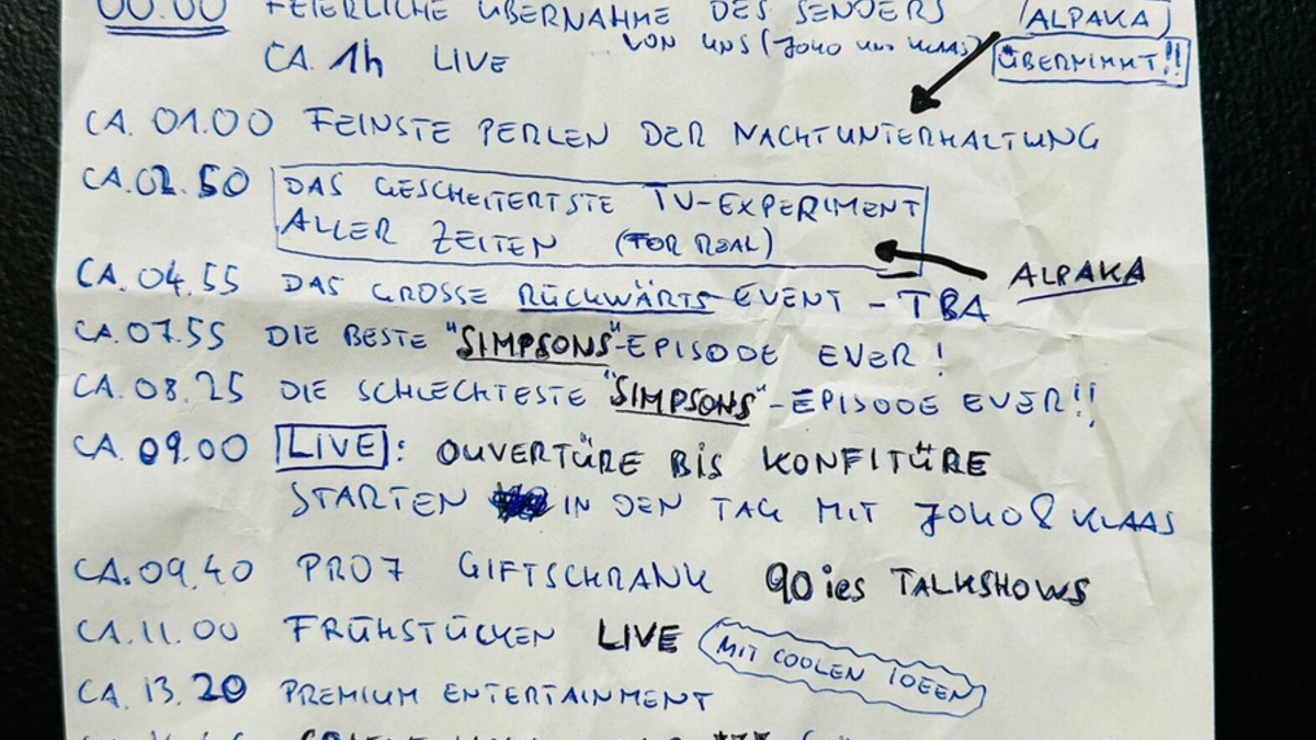 Auf mehrfache Nachfrage von ProSieben haben Joko & Klaas in ihrer Funktion als Programmdirektoren den Sonntag jetzt "geplant" und uns lediglich den im Anhang befindlichen "Programmzettel" zugestellt. Entsprechend ändert ProSieben das Programm mit Überraschungen am Sonntag, 21. April 2024.