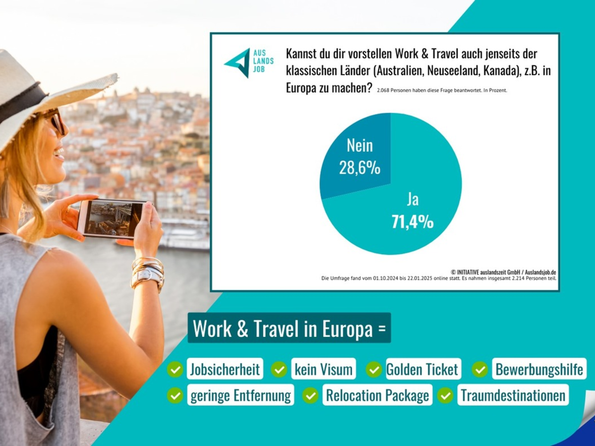 Die Ergebnisse der Auslandsjob-Umfrage 2024/Anfang 2025 zeigen klar: Europäische Länder sind gefragter denn je. Spanien, Italien und Portugal zählen zu den beliebtesten Zielregionen. "Insgesamt können sich über 70 Prozent der Befragten vorstellen, Work and Travel in Europa zu machen, wie auch unsere aktuelle Auslandsjob-Infografik zeigt. Die Vorteile liegen auf der Hand: Kein Working-Holiday-Visum, weniger Bürokratie und eine schnelle Jobaufnahme", erklärt Frank Möller, Gründer von Auslandsjob.de.