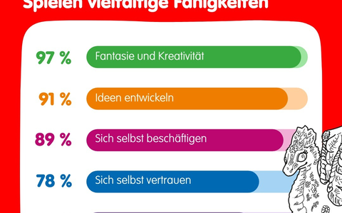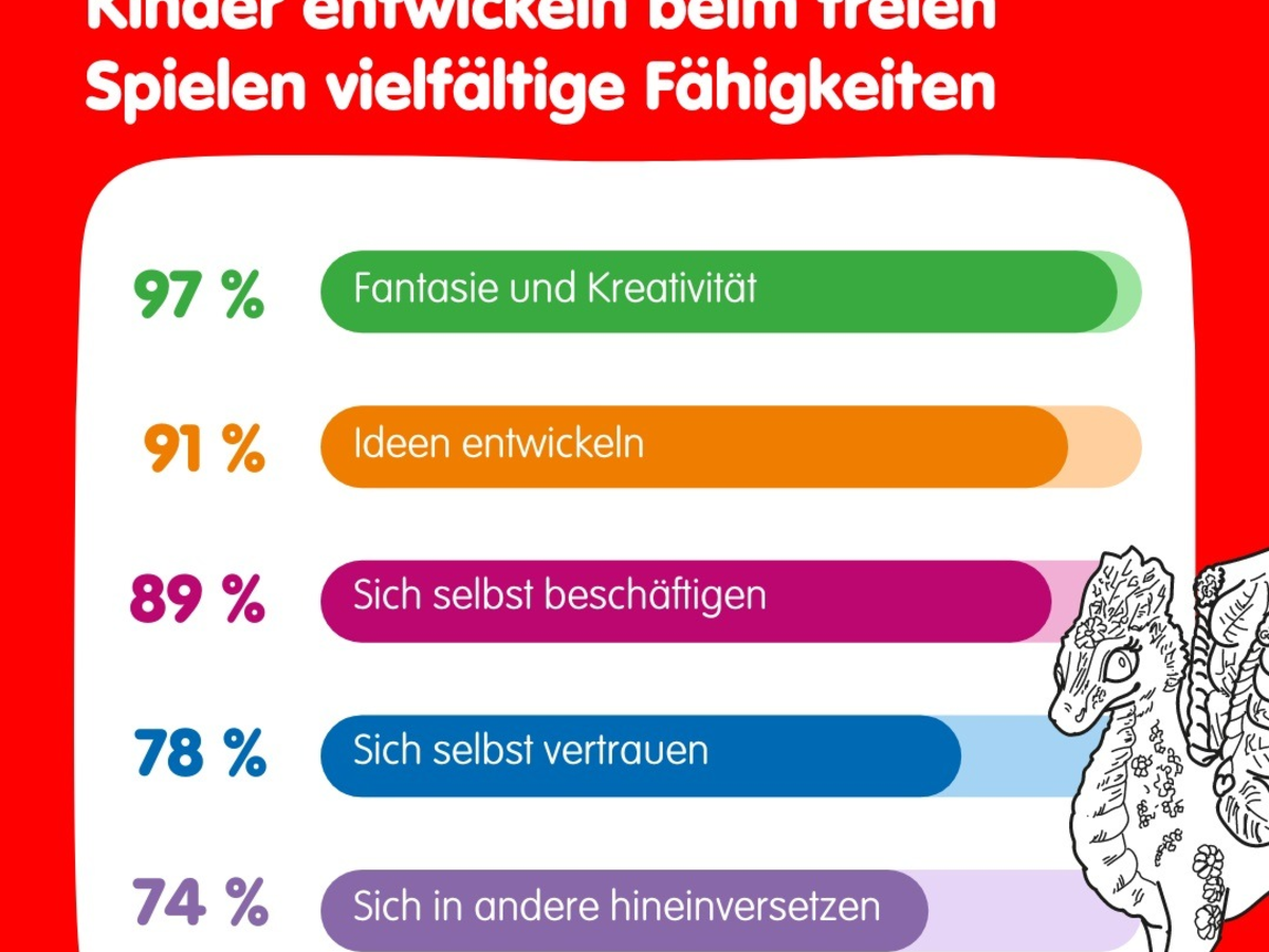 Können ein Tyrannosaurus Rex und ein Löwenkopfkaninchen beste Freunde werden? Darf der Papagei schwimmen und das Einhorn ein Bauarbeiter sein? Ein Blick in die grenzenlose Fantasie von Kindern zeigt: Alles ist möglich. "Das freie Spielen fördert Kinder in ihrer Entwicklung und sie erlernen wichtige Zukunftsfähigkeiten wie Kreativität, Lösungsfindung und Selbstvertrauen", erklärt Professorin Dr. Wiebke Waburg, Professorin für Pädagogik der Universität Koblenz. "Dies sehen auch die Eltern so. Unsere Studie zeigt, dass 97 % der Eltern davon überzeugt sind, freies Spielen stärke die Fantasie und Kreativität ihrer Kinder. 91 % meinen, es stärke die Fähigkeit, eigene Ideen zu entwickeln." Die Eltern gehen auch davon aus, dass Kinder im freien Spiel lernen, sich selbst zu beschäftigen (89 %), sich selbst zu vertrauen (78 %) und sich in andere hineinzuversetzen (74 %).