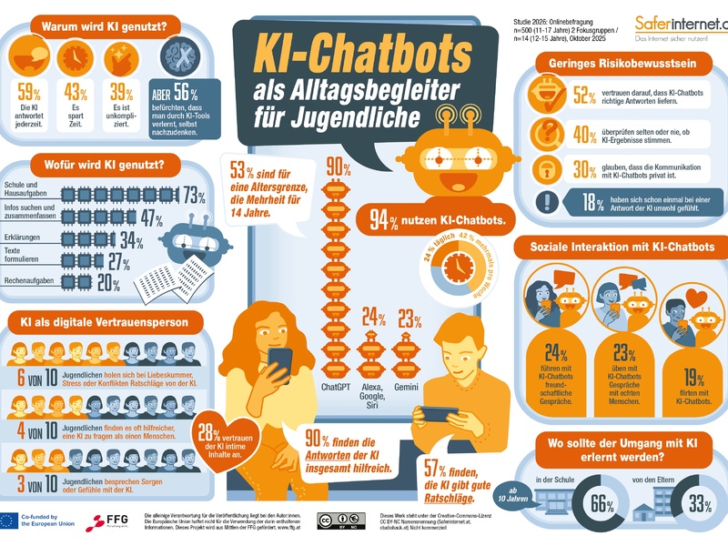 Wien - Anlässlich des 23. internationalen Safer Internet Day am 10. Februar 2026 präsentierte Saferinternet.at (https://www.saferinternet.at) die aktuelle Studie "KI-Chatbots als Alltagsbegleiter für Jugendliche". Die Ergebnisse zeigen deutlich: Künstliche Intelligenz (KI) ist für Jugendliche inzwischen ein selbstverständlicher Begleiter. 94 Prozent der 11- bis 17-Jährigen nutzen KI-Chatbots – vor allem für schulische und zunehmend auch für persönliche Themen. Dabei unterschätzen sie die Risiken, wünschen sich jedoch mehr Bildung zu KI und befürworten Altersgrenzen.