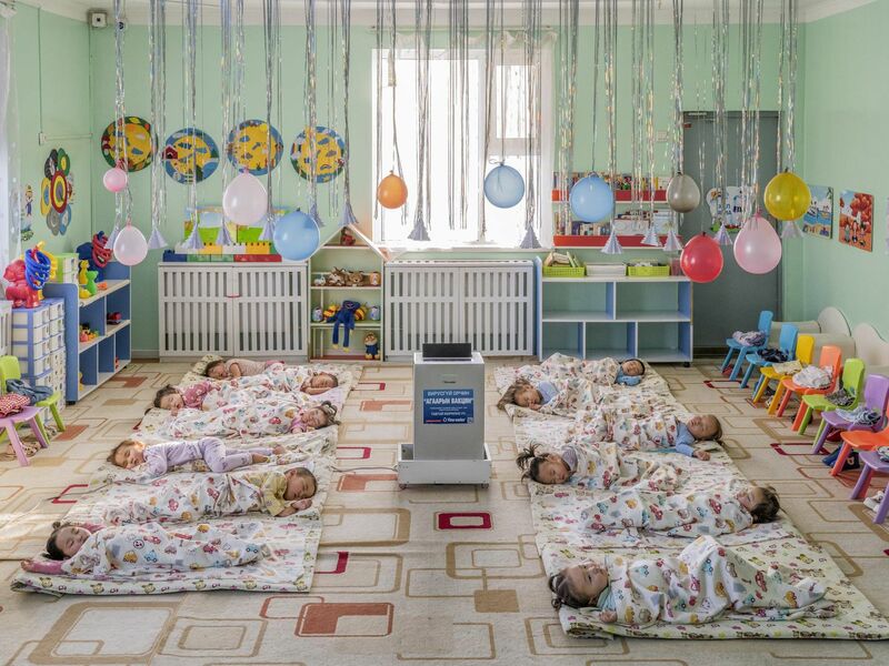 Der zweite Preis geht an Natalya Saprunova, geboren in Russland und wohnhaft in Frankreich, für ein Bild ihrer Reportage aus der Mongolei, in der Kinder unter extremer Luftverschmutzung leiden. Zu sehen sind Kleinkinder, die in einem Kindergarten rund um einen Luftfilter schlafen, der die Schadstoffkonzentration etwas mindern soll.
