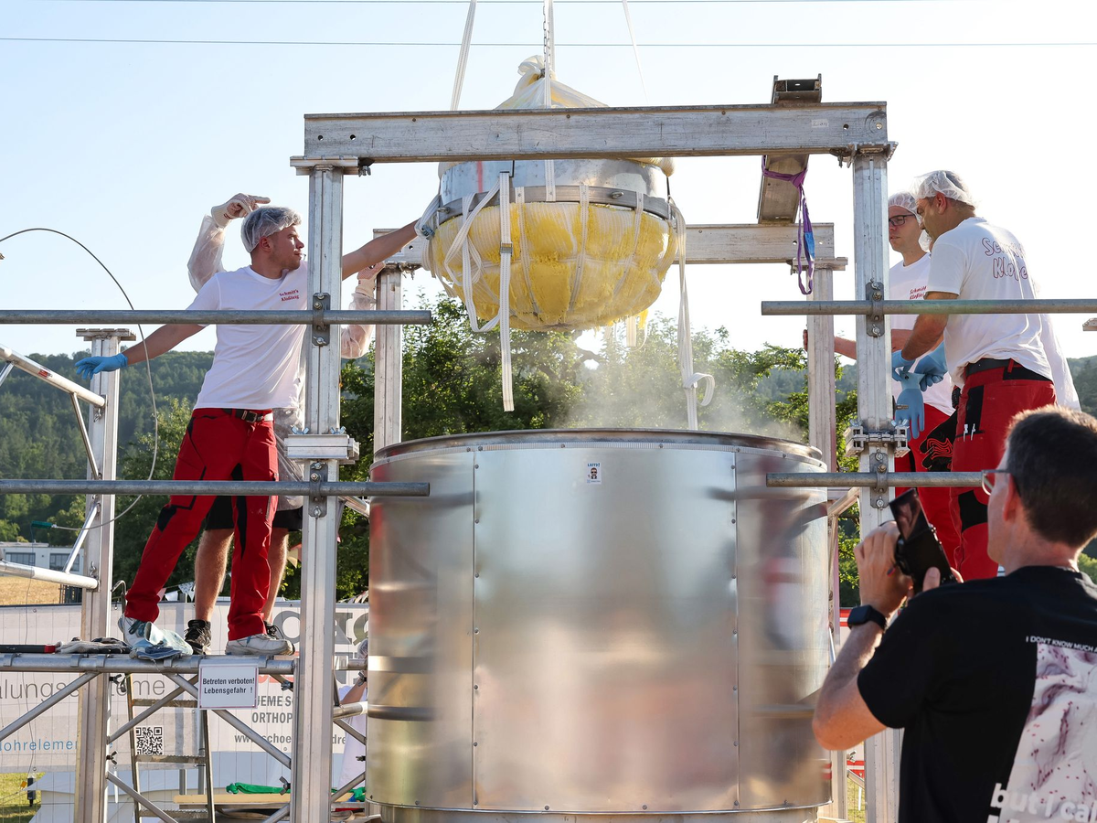 22.06.2025 - 09:26:32 | dpa.deIm unterfränkischen Dorf Wombach ist bei einem Weltrekordversuch ein fast 465 Kilogramm schwerer Kartoffelkloß gekocht worden. Mit der Aktion wurde ein früherer Rekord aus Jena in Thüringen deutlich übertroffen. Die Menschen aus dem 2.000 Seelen großen Ortsteil der Stadt Lohr am Main hatten den «größten Kloß der Welt» im Rahmen ihrer Feier zum 700-Jahr-Jubiläum des Dorfes gekocht und verspeist.