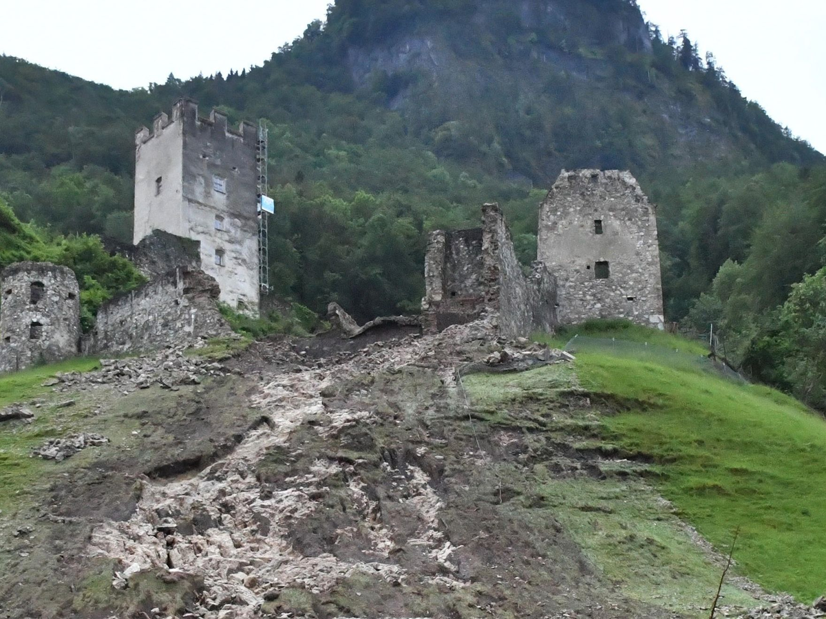 Hochwasser - Teile einer Burgruine rutschen ab