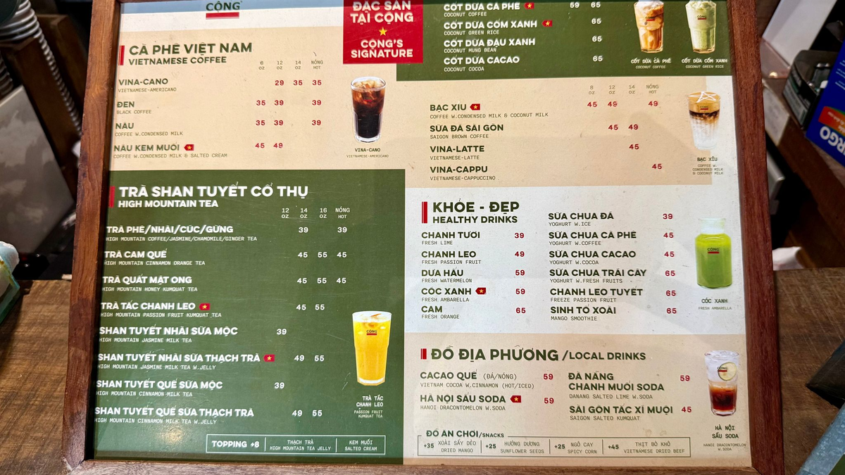 Gleichzeitig ist das südostasiatische Land nach Brasilien der zweitgrößte Kaffeeproduzent der Erde - und international berühmt als Kaffeehochburg mit kräftigen Robusta-Bohnen. Absolute Spezialität und Bestseller im Cong Caphe ist ein eisgekühlter Kokosnuss-Kaffee. Aber es gibt auch versöhnliche Getränke - wie den tiefschwarzen «Vina-Cano», kurz für «Vietnamese-Americano».