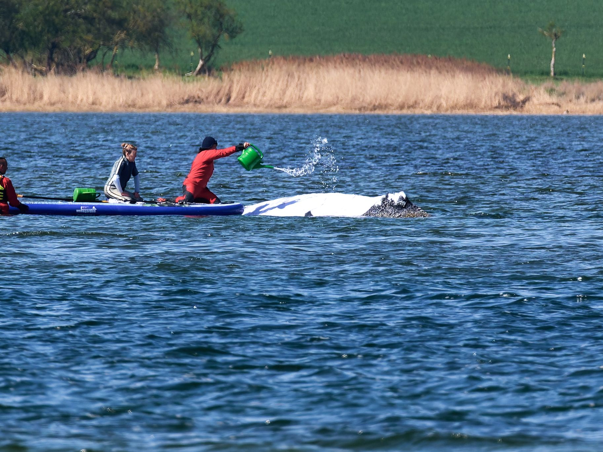 Der rund zwölf Meter lange Wal steckt seit rund drei Wochen in der Kirchsee-Bucht der Insel Poel fest. Die private Rettungsinitiative, die vom Mediamarkt-Gründer Walter Gunz und von der Unternehmerin Karin Walter-Mommert finanziert wird, will den Wal zurück in den Atlantik bringen.