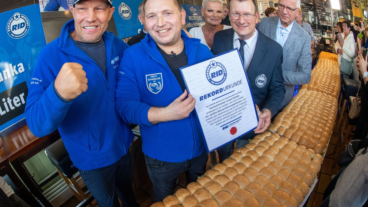 Fisch, Salat und Zwiebeln satt - der Usedomer Gastronom André Domke hat im Oktober das größte Fischbrötchen der Welt belegt. Mit 6,68 Metern war es mehr als zwei Meter länger als der bisherige Rekord. «Kiloweise «Lollo Bionda»-Salat, bergeweise Zwiebeln und fässerweise Bismarckhering aus der Ostsee» verarbeiteten er und sein Team, wie Domke der Deutschen Presse-Agentur sagte. Das Rekord-Institut für Deutschland (RID) bestätige seine Leistung mit einer Urkunde.