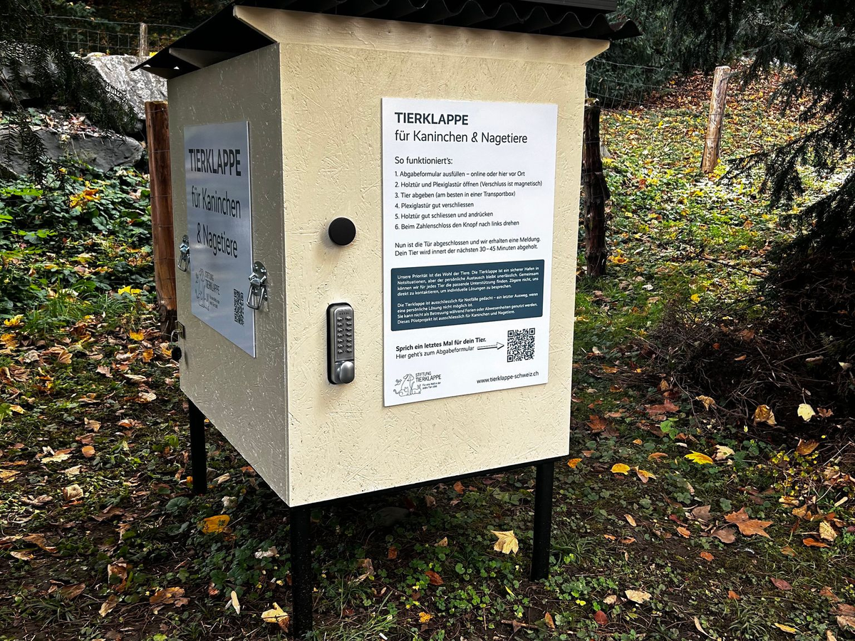 Die große Holzbox mit Ventilator und Kamera steht an einem Waldrand in Hilterfingen rund 30 Kilometer südöstlich von Bern. Wenn jemand ein Tier hineintut und die Box verschließt, werden Tierschützer alarmiert, die es innerhalb von weniger als einer Stunde abholen. Der Name «Tierklappe» ist etwas irreführend und erinnert an Babyklappen bei Krankenhäusern, in die Mütter in Not anonym ihre Neugeborenen legen können.