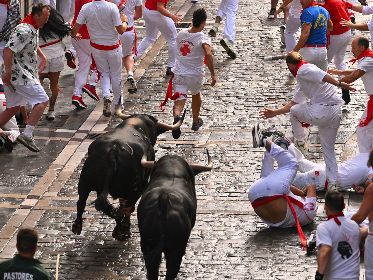Zahlreiche Teilnehmer wurden von den zum Teil über 600 Kilogramm schweren Kampfbullen überrannt, wie bei der TV-Liveübertragung zu sehen war. Große Aufregung gab es, als zwei Stiere auf dem feuchten Kopfsteinpflaster ausrutschten und stürzten. Die Verletzten, allesamt junge Männer, seien mit Prellungen und Quetschungen ins Krankenhaus gebracht worden, hieß es.