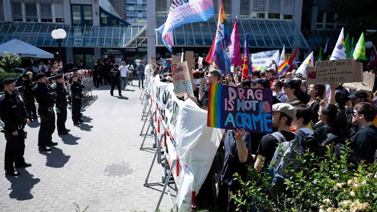 «Finger weg von unseren Kindern» heißt es auf Plakaten, andere warnen vor einer Frühsexualisierung. Die Zahl der Befürworter der Lesung ist aber mehr als doppelt so hoch: Rund 500 junge Menschen, viele bunt geschminkt und kostümiert, erheben ihre Stimmen gegen Hetze und für Diversität und Toleranz - lautstark, aber friedlich, wie die Polizei feststellt.