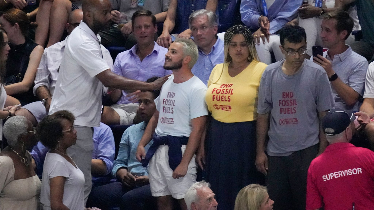 Zunächst wurden nach Angaben der Organisatoren in einer Mitteilung drei Personen abgeführt. «Als die Sicherheitskräfte ankamen, hatte sich eine Person mit nackten Füßen auf dem Boden festgeklebt», sagte Turnierdirektorin Stacey Allaster bei ESPN und erklärte damit die lange Unterbrechung. Die New Yorker Polizei und medizinisches Personal seien notwendig gewesen, um die Person aus dem Stadion zu entfernen, hieß es weiter. Der Mann wurde in Handschellen von Polizisten abgeführt. Alle vier Personen waren laut den Organisatoren in Polizeigewahrsam.