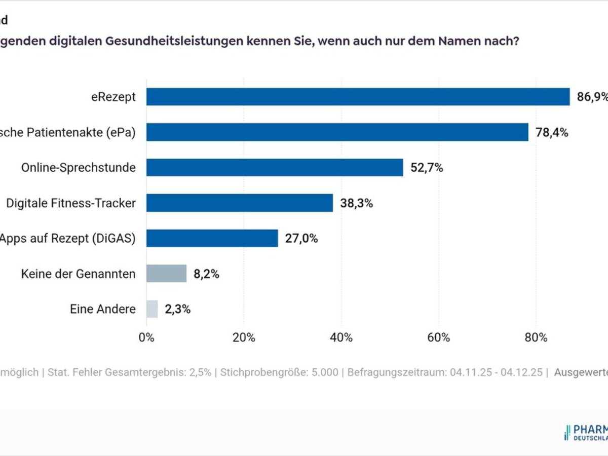 Das E-Rezept ist mit 86,9 Prozent die bekannteste und mit knapp 60 Prozent Nutzung die etablierteste digitale Anwendung im Gesundheitswesen. Allerdings ist die Zahl der E-Rezept-Nutzer im letzten halben Jahr nur leicht von 55,7 Prozent auf aktuell 59,3 Prozent gestiegen (Stand 04.12.2025). Die elektronische Patientenakte (ePA), die vor allem von sich noch in Ausbildung befinden Menschen genutzt [PE1] wird, hat die Zahl der Nutzer deutlicher steigern können. Während Anfang Juni nur 12,1 Prozent der Befragten angaben, die ePA zu nutzen, sind es Anfang Dezember immerhin 20,3 Prozent. Die Gesundheits-Apps auf Rezept (DiGAs) sind dagegen weniger als ein Drittel (27,0 Prozent) der Bürgerinnen und Bürger bekannt und werden nur von 5,4 Prozent genutzt.