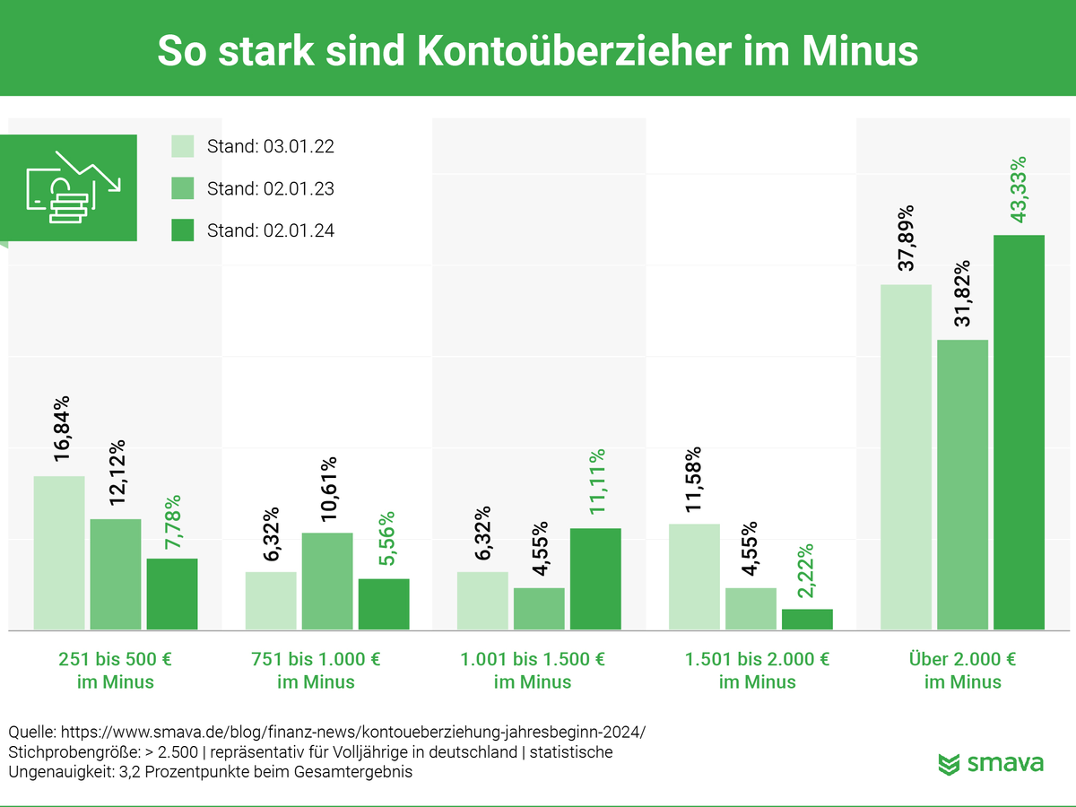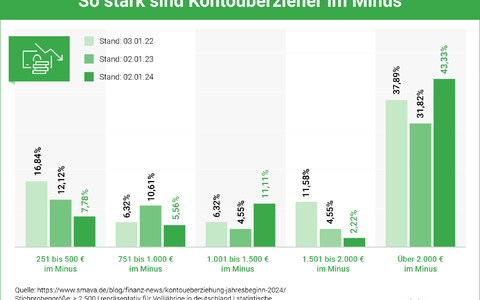 Während Anfang 2022 noch 16,84 % der Kontoinhaber im Minusbereich von 251 bis 500 Euro lagen, sank dieser Anteil bis Anfang 2024 auf 7,78 %. Diese Entwicklung deutet darauf hin, dass sich immer mehr Menschen auf höhere Überziehungssummen einlassen. Besonders auffällig ist der Anstieg bei den Überziehungen von mehr als 2.000 Euro. Anfang 2022 lag der Anteil noch bei 31,82 %, stieg jedoch bis Anfang 2024 auf besorgniserregende 43,33 % an.