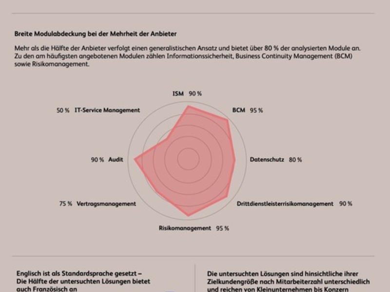 Die Studie macht deutlich, dass sich Anbieter insbesondere hinsichtlich Modularität, Zielkundensegmenten und Lizenzmodellen unterscheiden. Während zahlreiche Lösungen zentrale Bereiche wie Informationssicherheit, Risikomanagement, Audit oder Business Continuity unterstützen, decken nur wenige Anbieter sämtliche Funktionsbereiche vollständig ab.