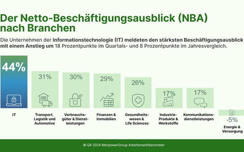 Die Informationstechnologie ist im 4. Quartal der am stärksten wachsende Sektor mit einem NBA von 44 Prozent, einem Anstieg um 18 Punkte zum Vorquartal. Deutschland belegt damit weltweit Platz sieben in diesem Sektor. Auch die Bereiche Transport, Logistik & Automotive (NBA 31 Prozent) und Konsumgüter & Dienstleistungen (NBA 30 Prozent) entwickeln sich hinsichtlich der Einstellungserwartungen positiv. Dagegen verzeichnet der Energie- und Versorgungssektor starke Schwankungen und fällt aufgrund geopolitischer Spannungen, schwankender Ölpreise und neuer Nachhaltigkeitsvorschriften auf einen NBA von -5 Prozent.
