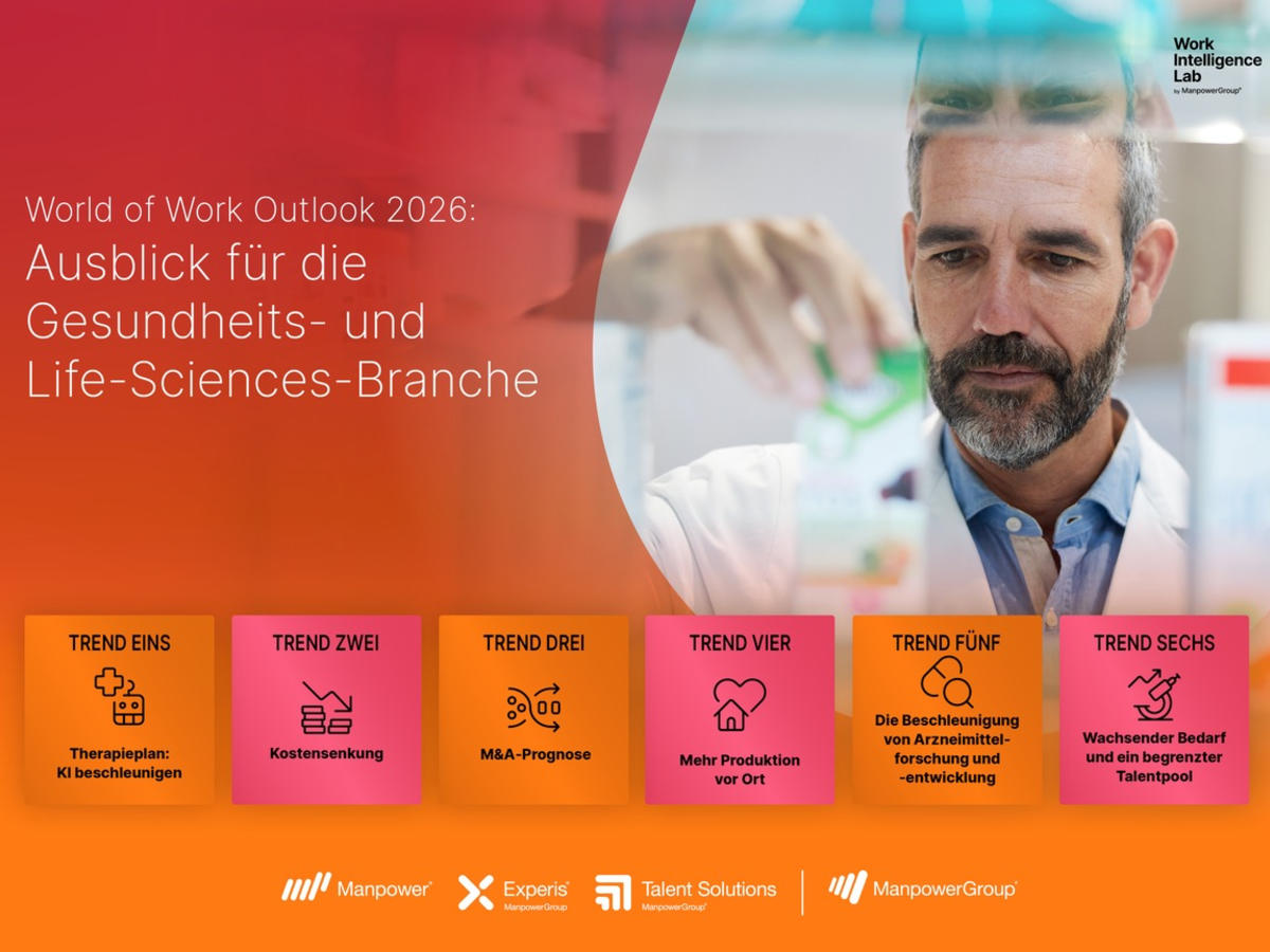 Der Gesundheits- und Life-Sciences-Sektor steht weltweit vor einer doppelten Herausforderung: Während der Bedarf an medizinischer Versorgung durch demografischen Wandel, chronische Erkrankungen und ein sich wandelndes Gesundheitsbewusstsein weiter steigt, verschärft sich der Fachkräftemangel in der Branche dramatisch. Gleichzeitig wächst der Druck, Künstliche Intelligenz (KI) schneller und wirksamer in Prozesse, Forschung und Personalstrategien zu integrieren. Das zeigt der neue "World of Work Outlook 2026 - Ausblick für die Gesundheits- und Life-Sciences-Branche" der ManpowerGroup.