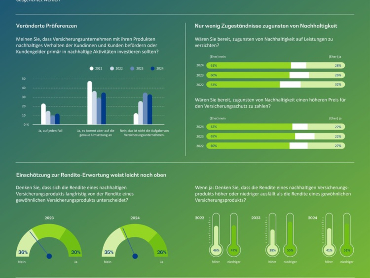 Zu einer Zahlung einer höheren Prämie für einen nachhaltigen Zweck wären in diesem Jahr 27 Prozent der Deutschen bereit. Dieser Umfragewert entspricht dem der Befragung 2022, lediglich im vergangenen Jahr lag er fünf Prozentpunkte niedriger.