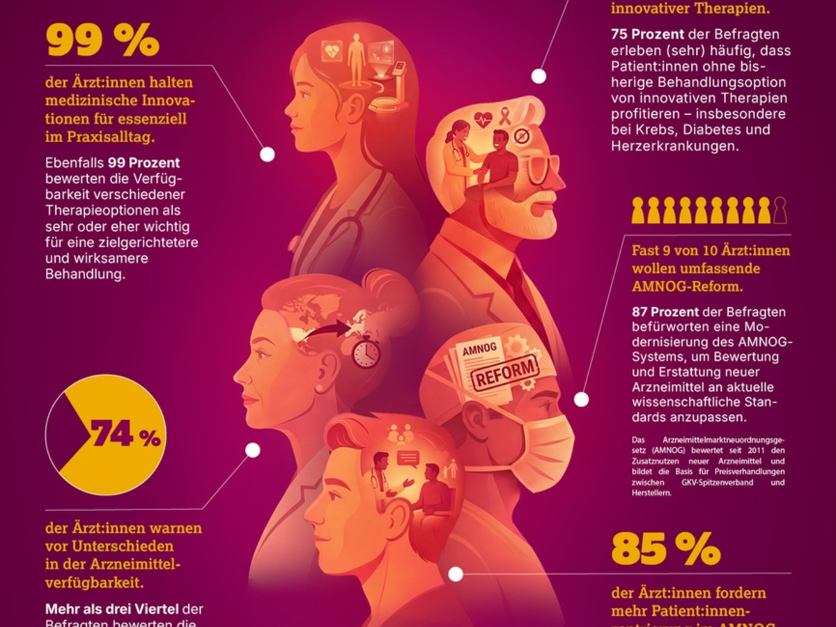 Die Umfrage macht deutlich: Ärzt:innen betrachten medizinische Innovationen als essenziell für die Versorgung von Patient:innen. Um Deutschland in Zukunft den Weg zu mehr Innovationen zu ebnen, braucht es zeitgemäße Rahmenbedingungen und Bewertungsverfahren, eine stärkere Berücksichtigung patient:innenzentrierter Kriterien sowie höhere Investitionen, die den Wert medizinischer Innovationen anerkennen.