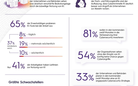 Angesichts der neuen Möglichkeiten steigt bei den befragten Unternehmen und Behörden die Sorge, dass sich die Kräfteverhältnisse in Richtung der Angreifer verschieben. 71 Prozent der Fach- und Führungskräfte sind der Auffassung, dass Cyberkriminelle KI deutlich besser zum Angriff nutzen, als dies Unternehmen zur Abwehr tun. Doch es gibt auch positive Signale: So wächst in den befragten Organisationen das Bewusstsein für eine KI-basierte Cybersecurity. 81 Prozent planen generell, in den kommenden zwölf Monaten in die Verbesserung ihrer Cybersicherheit zu investieren. Immerhin jede dritte Organisation hat erkannt, dass es durch KI neue Möglichkeiten zum Schutz von IT-Systemen gibt. 54 Prozent sehen ohne den Einsatz von KI künftig keine Chance gegen Cyberangriffe.