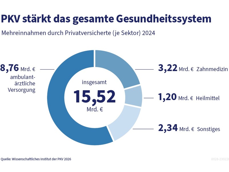 03.03.2026 - 10:55:10 | presseportal.deDie PKV-Versicherten spielen für das Gesundheitswesen in Deutschland eine immer wichtigere Rolle: Im Jahr 2024 erreichte ihr Mehrumsatz 15,52 Milliarden Euro und damit nochmals 1,06 Milliarden Euro bzw. 7,3 Prozent mehr als im Jahr davor. Das geht aus einer aktuellen Studie des Wissenschaftlichen Instituts der PKV (WIP) hervor. Mit 8,76 Milliarden Euro entfiel der größte Teil des Mehrumsatzes erneut auf die ambulant-ärztliche Versorgung. In diesem Bereich gab es einen Zuwachs von 9,6 Prozent. Bezogen auf den einzelnen niedergelassenen Arzt entspricht dies Zusatzeinnahmen von durchschnittlich je 82.171 Euro.