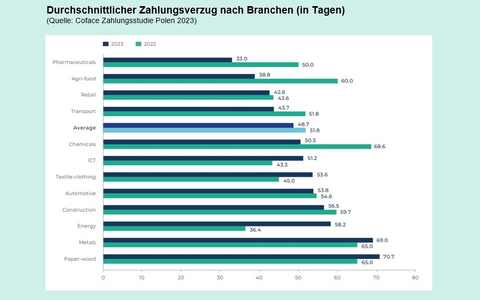Stark verbessert hat sich 2023 die Zahlungsdisziplin von Geschäftspartnern polnischer Firmen. Zwar geben noch immer 49,3 Prozent der Befragten an, Zahlungsverzögerungen erlebt zu haben. Jedoch ist dieser Wert eine deutliche Verbesserung im Vergleich zur vorangegangenen Umfrage, bei der 2022 noch 61,2 Prozent von Zahlungsverzug berichteten. "Bei der Befragung im Jahr 2019, also vor Ausbruch der Corona-Pandemie, berichteten noch über 90 Prozent von Zahlungsverzögerungen. Die Zahlungsmoral ist aktuell also noch deutlich besser als vor Corona", sagt Grzegorz Sielewicz, Coface-Volkswirt für Zentral- und Osteuropa. Zum Vergleich: In Deutschland berichteten zuletzt 76 Prozent, in Frankreich 82 Prozent und in China 83 Prozent der befragten Unternehmen von verspäteten Zahlungen. Auch die Dauer der durchschnittlichen Zahlungsverzögerungen ist rückläufig - sie ist um 3 Tage auf 49 Tage gesunken und hat sich damit dem Niveau von 2020 (48 Tage) angenähert. Dabei ist zu beachten, dass im Jahr 2020 noch pandemiebedingte Stützungsmaßnahmen die Unternehmen in ihrem Zahlungsverhalten unterstützten, während diese Hilfen 2023 schon lange ausgelaufen waren. Die längsten Zahlungsverzögerungen verzeichnen energieintensive Wirtschaftszweige wie die Papier- und Holzindustrie sowie die Metallbranche mit durchschnittlich 71 bzw. 69 Tagen Zahlungsverzug. Der Textil- und Bekleidungssektor sowie der Informations- und Kommunikationssektor meldeten ebenfalls längere Zahlungsverzögerungen. "Beide Wirtschaftszweige sind mit dem Rückgang des verfügbaren Einkommens der Verbraucher konfrontiert. Die Haushalte legen ihr Augenmerk hauptsächlich auf Ausgaben für den täglichen Bedarf und nicht auf langlebige Gebrauchsgüter", sagt Grzegorz Sielewicz.