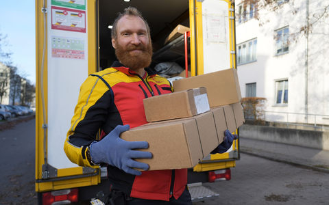 Ein Balanceakt vor dem Wohnhaus in Berlin-Karow: Auf dem einem Arm stapeln sich die Pakete, die andere Hand drückt auf die Klingel. Der Türsummer - schnell rein, die Treppe hoch, vier Stockwerke. «Hallo, hier ist Ihr Paket, danke, schönen Tag noch», sagt DHL-Paketbote Steve Josch und eilt die Treppe wieder herunter zum gelben Transporter. In der Weihnachtszeit darf er keine Zeit verlieren.