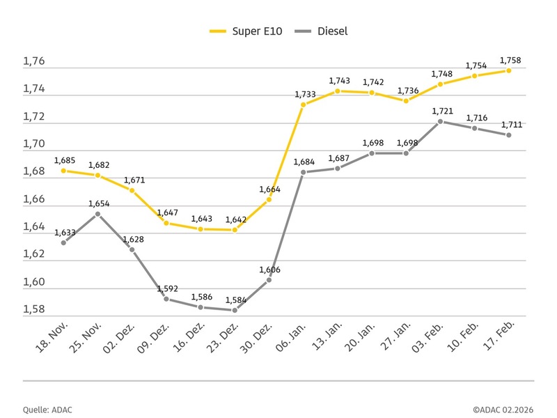 18.02.2026 - 13:53:13Der Preis für Rohöl der Sorte Brent ist seit der letzten Woche um rund zwei US-Dollar gesunken und liegt derzeit bei gut 67 US-Dollar. Der Euro hat im Vergleich zum US-Dollar minimal an Kraft eingebüßt und pendelt in den letzten Tagen zwischen 1,18 und 1,19 US-Dollar. Insofern wäre auch bei Super E10 angesichts des niedrigeren Ölpreises ebenfalls mit einem leichten Preisrückgang zu rechnen gewesen. Die Preisschere zwischen Benzin- und Dieselpreis ist mit der aktuellen Entwicklung erneut ein wenig größer geworden, aber immer noch weit von einem angemessenen Zustand entfernt. Derzeit beträgt die Differenz zwischen den beiden Sorten nur 4,7 Cent, obwohl auf den Liter Diesel rund 20 Cent weniger Steuern anfallen.