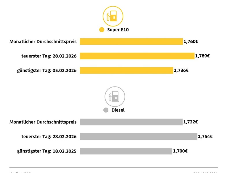 02.03.2026 - 13:58:09 | presseportal.deTeuerster Tag zum Tanken war das Monatsende: So kostete ein Liter Super E10 am 28. Februar 1,789 Euro, Diesel 1,754 Euro. Am günstigsten war Super E10 am 5. Februar mit 1,736 Euro, Diesel am 18. Februar mit 1,700 Euro je Liter. Die Monats-Höchstpreise am 28. Februar waren aus Sicht des ADAC nur ein Vorbote auf den jetzt drohenden Preisanstieg aufgrund des Krieges im Iran und der gesamten Golfregion mit der Sperre der Straße von Hormus, über die täglich rund ein Fünftel der globalen Öltransporte abgewickelt wird.