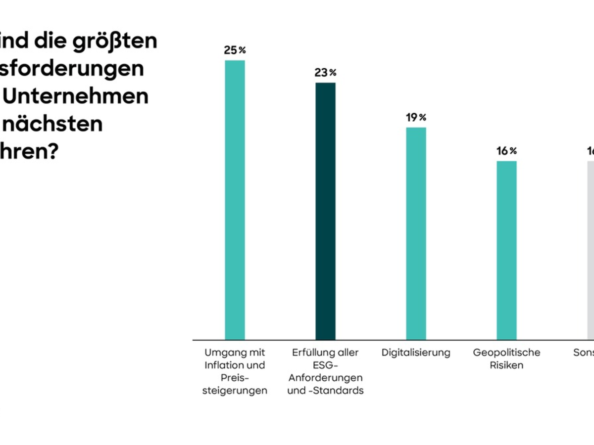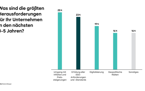 "Mehr als 70 Prozent der europäischen Unternehmen sind gesetzlich verpflichtet, die neue EU-Richtlinie über die Nachhaltigkeitsberichterstattung von Unternehmen (CSRD) einzuhalten", sagt Andreas Stocker, Partner bei Roland Berger. "Und auch Firmen, die nicht darunter fallen, müssen sich darauf einstellen, etwa weil sie als Zulieferer indirekt betroffen sind. Entsprechend wichtig ist das Thema für Führungskräfte." Die Einhaltung der ESG-Anforderungen und -Standards nennen daher 23 Prozent der Befragten als größte Herausforderung für die nächsten drei bis fünf Jahre, nur knapp getoppt vom aktuell bedeutsamsten Thema "Management von Inflation und Preissteigerungen" mit 25 Prozent der Nennungen. Mit Abstand folgen "Digitalisierung" (19%) und "geopolitische Risiken" (16%).