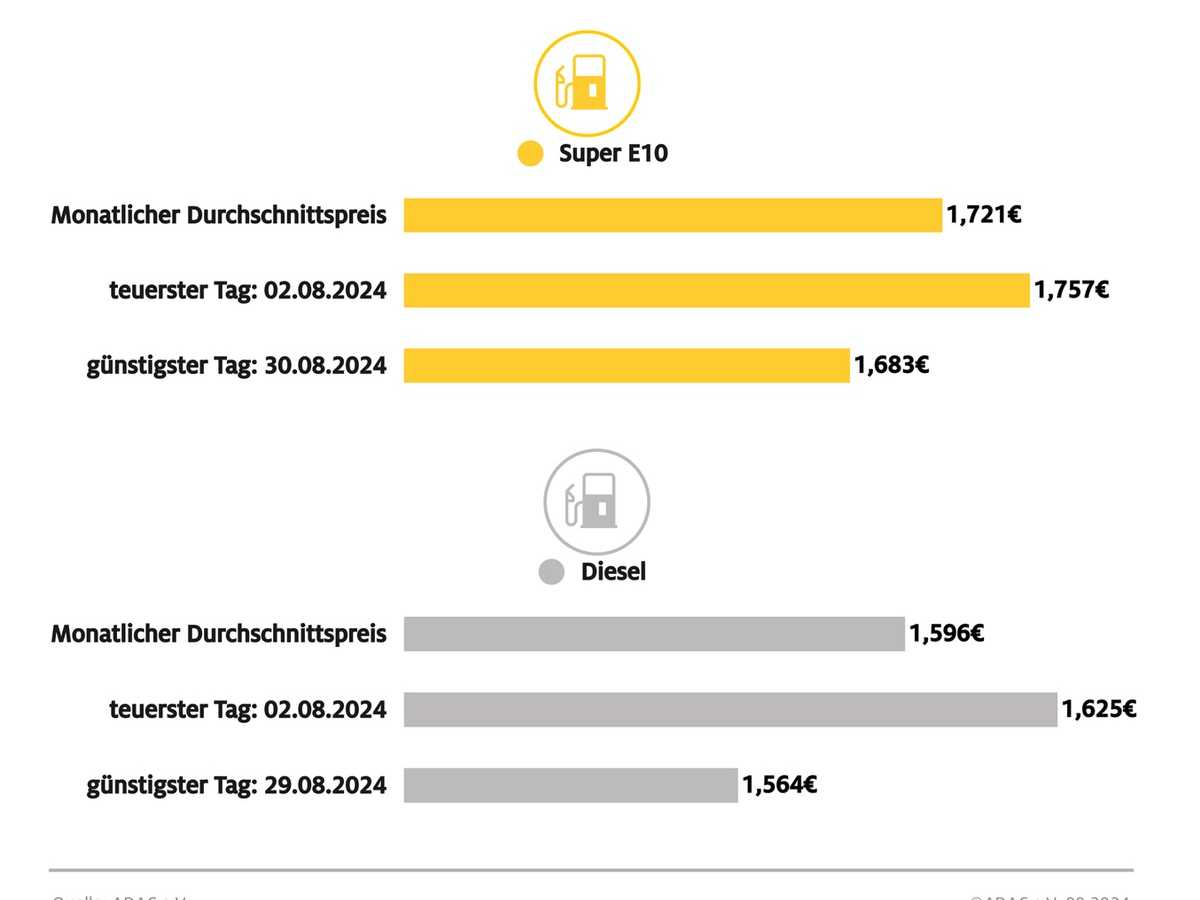 Niedrigste Kraftstoffpreise des Jahres im August / Jahrestiefststand bei Super E10 am 30. August, bei Diesel am 29. August