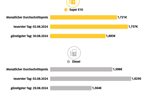 Für Super E10 lag der Durchschnittspreis des vergangenen Monats bei 1,721 Euro und erreichte damit nach 1,769 Euro im Juli den bisherigen Jahrestiefststand. Im Monatsschnitt war Super E10 zuletzt im Dezember 2023 günstiger. Der Durchschnittspreis für einen Liter Diesel lag im August bei 1,596 Euro (nach 1,652 Euro im Juli) und damit so niedrig wie seit Juni 2023 nicht mehr.