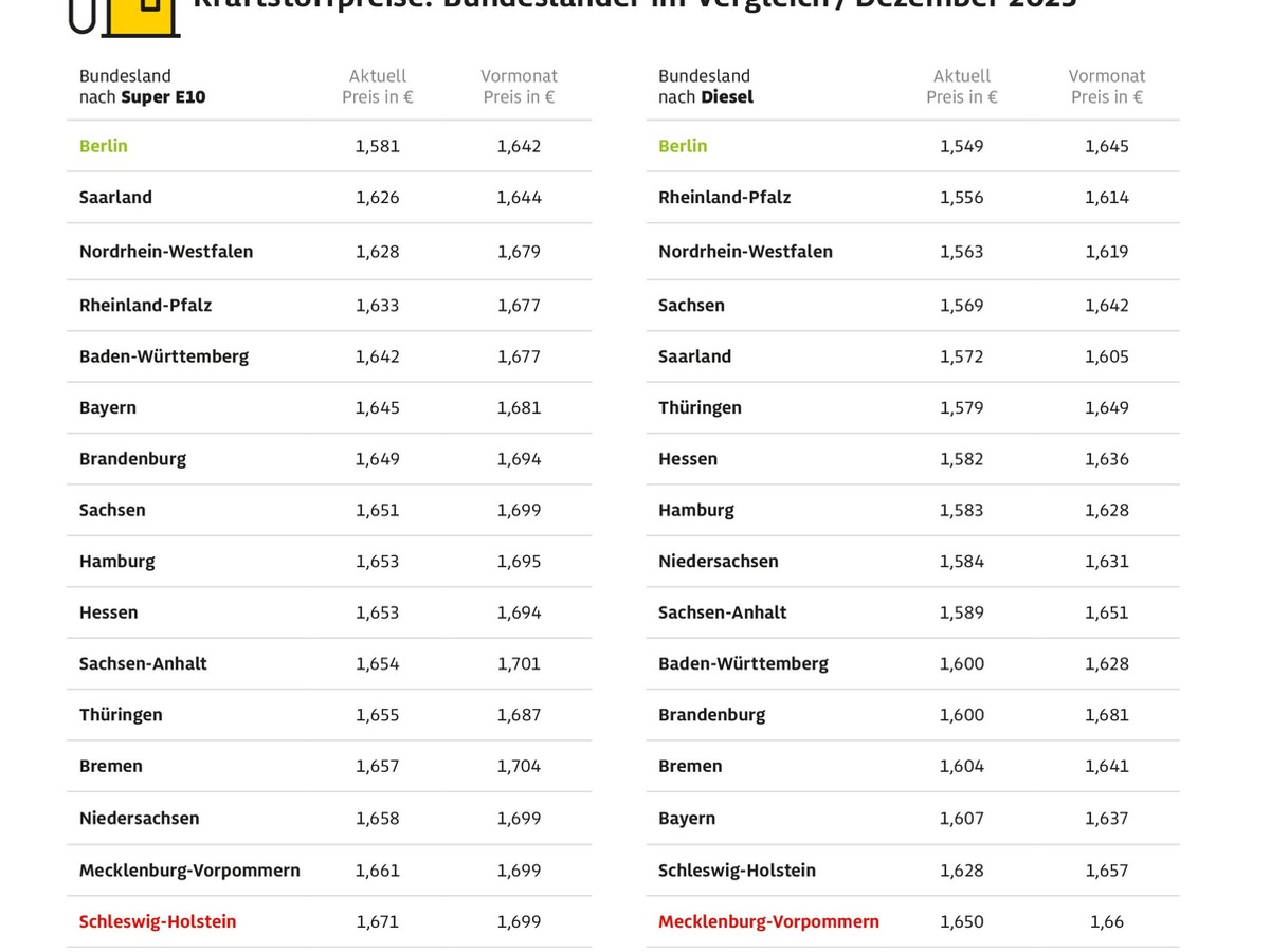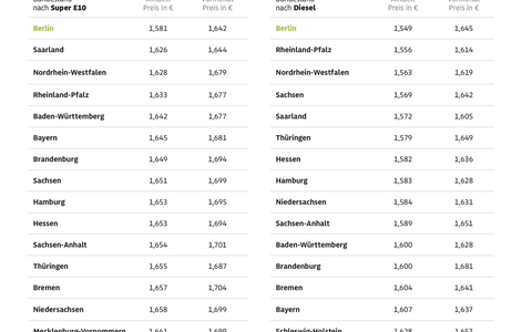 Für Super E10 müssen die Berliner Autofahrer derzeit 1,581 Euro je Liter hinlegen. Im Saarland, dem Zweitplatzierten im Bundesländer-Ranking, liegt der Literpreis mit 1,626 Euro immerhin 4,5 Cent über dem Berliner Preis. In Schleswig-Holstein, Letzter im Super E10-Ranking, müssen die Autofahrerinnen und Autofahrer derzeit 1,671 Euro je Liter bezahlen.