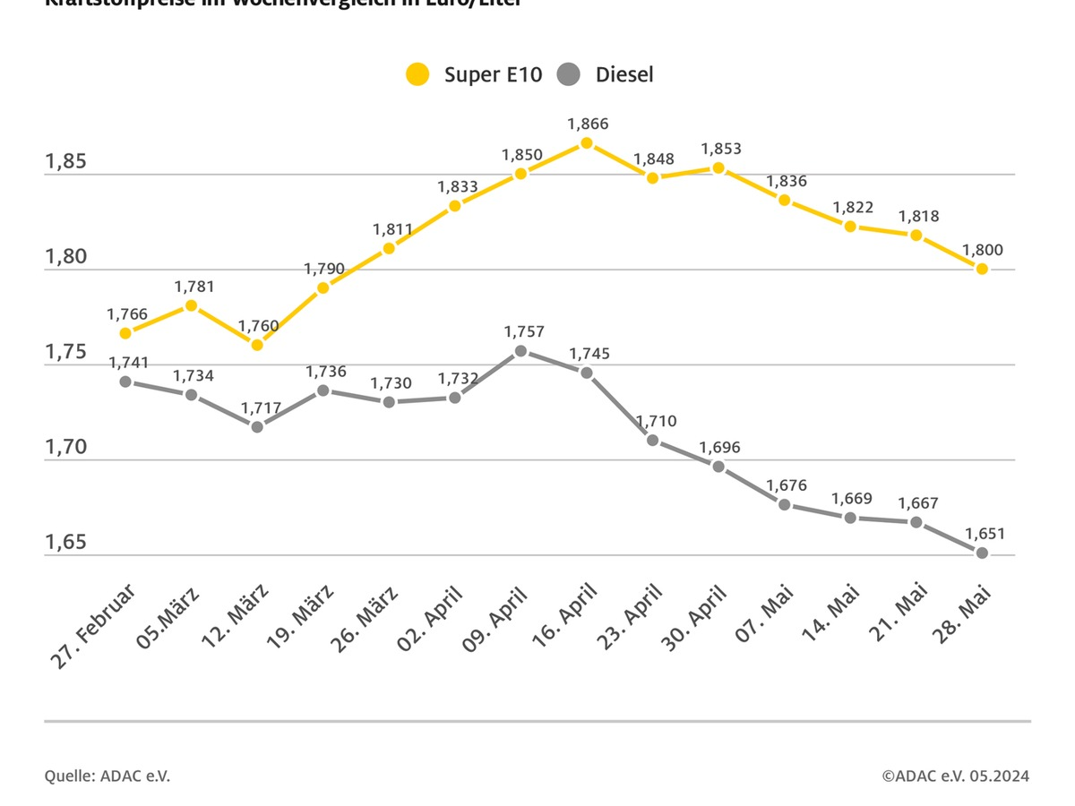 Erfreulich für Autofahrer ist, dass Diesel damit auf den niedrigsten Stand des Jahres fällt: Günstiger gab es einen Liter zuletzt Mitte Juli 2023. Die derzeitige Entwicklung der Kraftstoffpreise gehe in die richtige Richtung, so der ADAC. In den vergangenen Wochen hat der Club immer wieder darauf hingewiesen, dass die Spritpreise im Verhältnis zum Ölpreis und Euro-Dollar-Wechselkurs auf einem zu hohen Niveau liegen. Ein Barell der Sorte Brent kostet derzeit rund 84 US-Dollar und notiert damit ein wenig höher als in der vergangenen Woche. Der Euro-Dollar-Wechselkurs bleibt in etwa auf dem Niveau der Vorwoche.