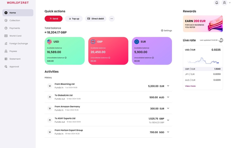 World Account ermöglicht Daueraufträge und die Verwaltung mehrerer Währungen. Über eine API können Zahlungsdaten sicher hochgeladen werden. Die Plattform bietet zudem Management-Funktionen wie Transferlimits und personalisierte Zugriffskontrollen.