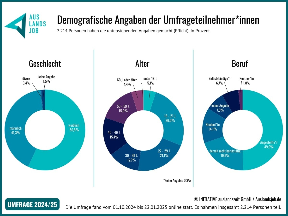 Vom 1.10.2024 bis zum 22.01.2025 hat die Auslandsjob Recruiting Solutions GmbH auf ihrem Fachportal www.auslandsjob.de zum zweiten Mal eine Umfrage zum Thema "Arbeiten im Ausland & Global Mobility" durchgeführt. An dieser nahmen insgesamt 2214 Personen teil, davon 1258 Frauen und 915 Männer. Im Vergleich zur Befragung 2022/23 haben einige Punkte an Relevanz gewonnen, andere stehen hinsichtlich Motivation, als Arbeitnehmer ins Ausland zu gehen, nach wie vor ganz oben.