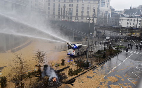 Bauern setzten Reifen in Brand, schütteten Gülle auf die Straße, und Pyrotechnik wurde gegen Polizisten gerichtet. Die Beamten setzten Wasserwerfer ein. Neben lautem Hupen sind auch immer wieder kleinere Explosionen zu hören.