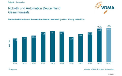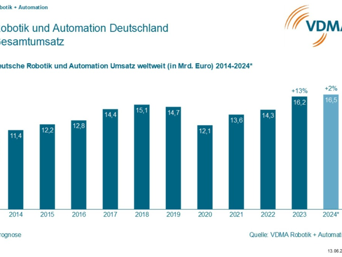Die Robotik und Automation in Deutschland wird bei verhaltener Inlandskonjunktur insbesondere vom Auslandsgeschäft getragen: Die Branche prognostiziert für 2024 eine Umsatzsteigerung von insgesamt 2 Prozent auf 16,5 Milliarden Euro. Im Vorjahr hatten die Unternehmen mit einem Umsatzplus von 13 Prozent einen Rekord von 16,2 Milliarden Euro erzielt.