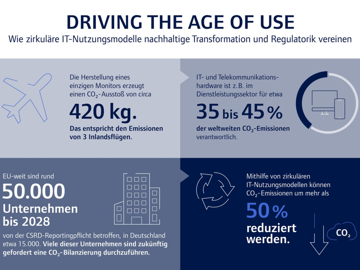 Mit modernen Nutzungsmodellen auf Basis der Kreislaufwirtschaft haben Kunden nicht nur die Möglichkeit, Betriebskosten zu senken, sondern auch ihre Nachhaltigkeitsbilanz zu optimieren. Letzteres gewinnt für Unternehmen zunehmend an Bedeutung, denn digitale Technologien haben einen teils erheblichen Anteil an den Gesamtemissionen von Unternehmen: Einer McKinsey-Studie zufolge sind allein IT- und Telekommunikationshardware, etwa im Dienstleistungssektor, für 35 bis 45 Prozent der gesamten CO2-Emissionen verantwortlich [1]. "Hier liegt ein enormes Einsparungspotenzial, das oft noch nicht ausreichend bekannt ist", erklärt Dr. Wagner. Setzen Unternehmen auf moderne technology2use-Konzepte, können sie die CO2-Emissionen ihrer eingesetzten IT-Hardware dank eines leistungsfähigen Lifecycle-Managements um mehr als 50 Prozent reduzieren [2].
