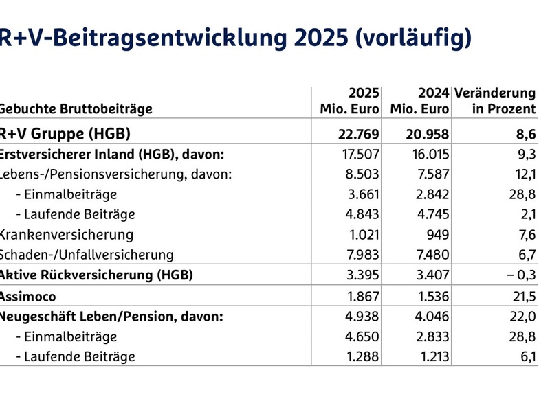 Die Beitragseinnahmen der R+V Gruppe stiegen 2025 um 8,6 Prozent auf 22,8 Milliarden Euro. Im deutschen Erstversicherungsgeschäft schloss die R+V Versicherung das Geschäftsjahr 2025 mit einem Plus von 9,3 Prozent auf 17,5 Milliarden Euro ab. "Angesichts des schwierigen Umfelds ist dies vor allem das Resultat einer starken Leistung aller R+V-Mitarbeitenden und Vertriebspartner in der genossenschaftlichen Finanzgruppe", betont der R+V-Chef. "Unser strategischer Anspruch ist, das Potenzial in den Genossenschaftsbanken noch stärker zu nutzen."