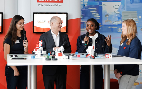 Seit 2003 gibt es den bundesweiten Tag zur Berufs- und Studienorientierung für Mädchen, wobei ein besonderer Fokus auf den MINT-Bereichen liegt (Mathematik, Informatik, Naturwissenschaften, Technik). Berliner Schülerinnen erkundeten gemeinsam mit Bundeskanzler Olaf Scholz einen Technik-Parcours von Mitgliedsunternehmen der Initiative D21. Mit dabei waren auch der Cornelsen Verlag und Cornelsen Experimenta, die mit ihrem Konzept erneut vom Bundeskanzleramt für den Rundgang ausgewählt wurden.