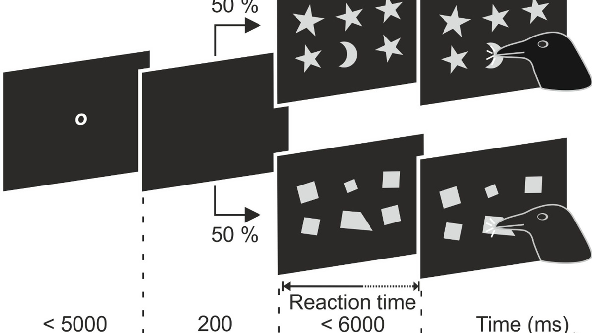 Das Team um Nieder trainierte zwei zehn und elf Jahre alte Rabenkrähen (Corvus corone) darauf, auf einem Bildschirm unter sechs Formen die jeweils abweichende zu erkennen. Hatten die Vögel den «Abweichler» erkannt, pickten sie auf diese Form. Zur Belohnung gab es Futter.