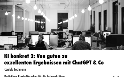 KI konkret 2: Von guten zu exzellenten Ergebnissen mit ChatGPT & Co / Dreiteiliger Praxis-Workshop für die fortgeschrittene KI-Nutzung in der Kommunikationsarbeit