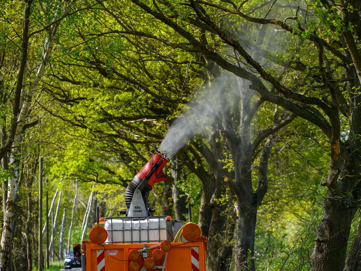 • An einer Landstraße wird ein biologisches Mittel mit Nematoden gegen den Eichenprozessionsspinner versprüht. - Foto: Philipp Schulze/dpa