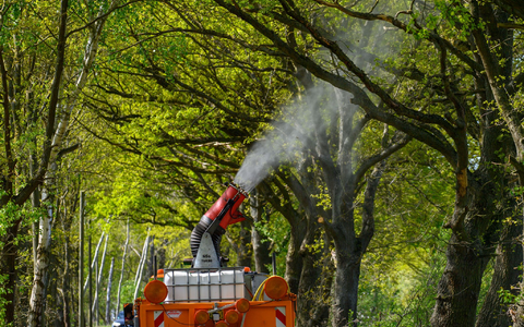 • Ein Lastwagen mit einer montierten Sprühkanone bekämpft Eichenprozessionsspinner. - Foto: Klaus-Dietmar Gabbert/dpa