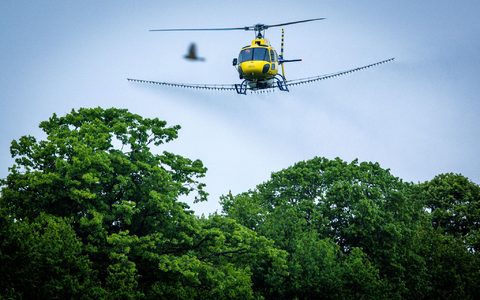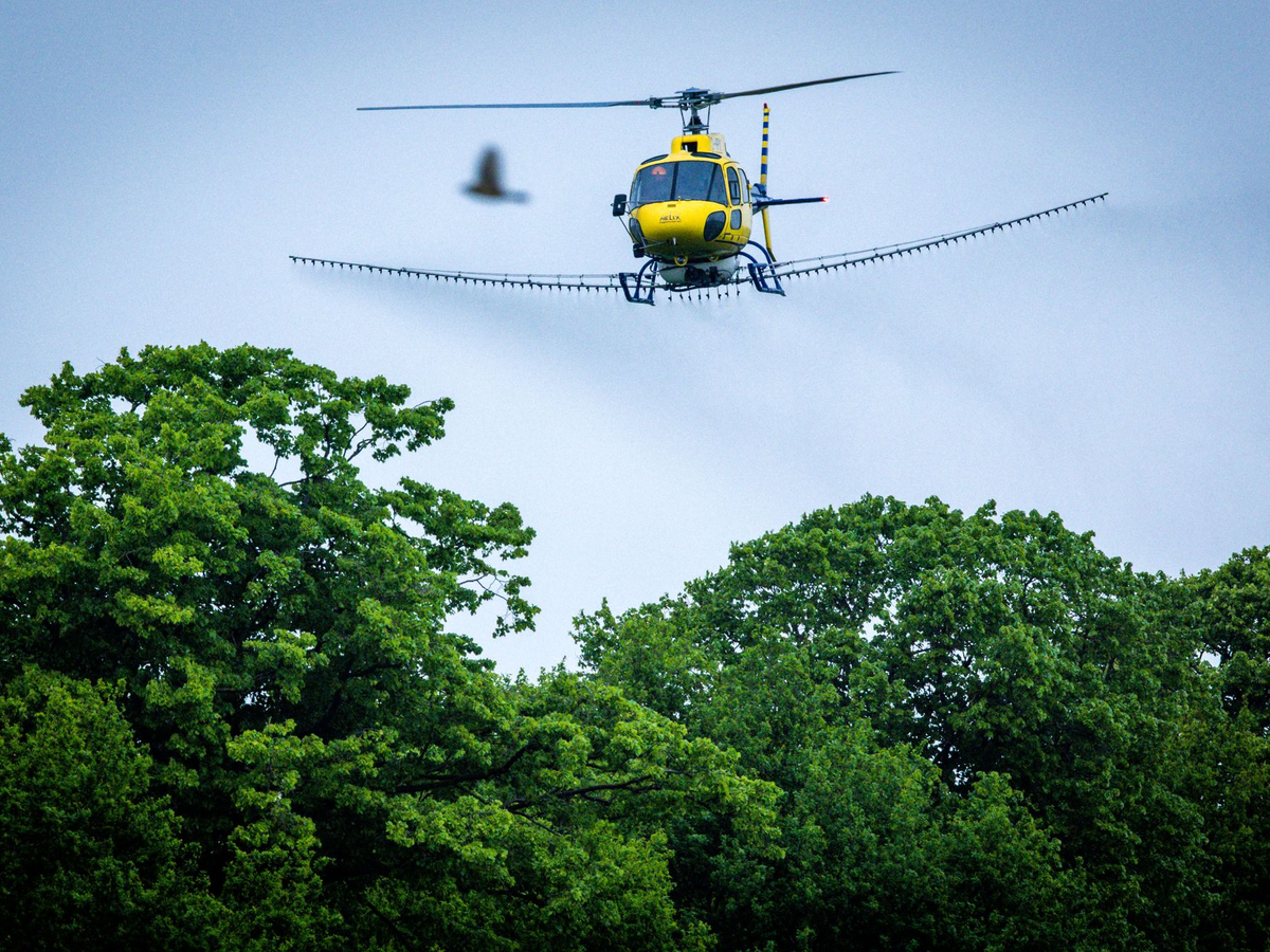 • Ein Spezialhubschrauber versprüht über einer Allee ein biologisches Insektizid gegen den Eichenprozessionsspinner. - Foto: Jens Büttner/dpa