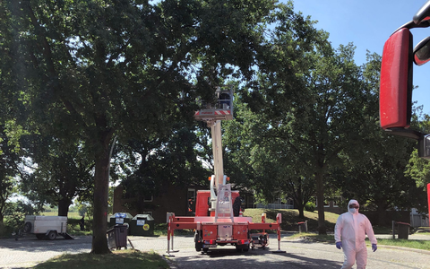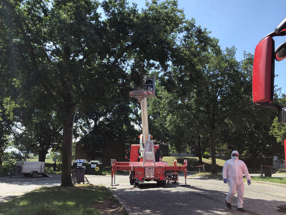 • Die Autobahnmeisterei lässt auf dem Rastplatz Stillhorn Ost Nester des Eichenprozessionsspinners von Bäumen absaugen. - Foto: Veronika Boge/-/dpa