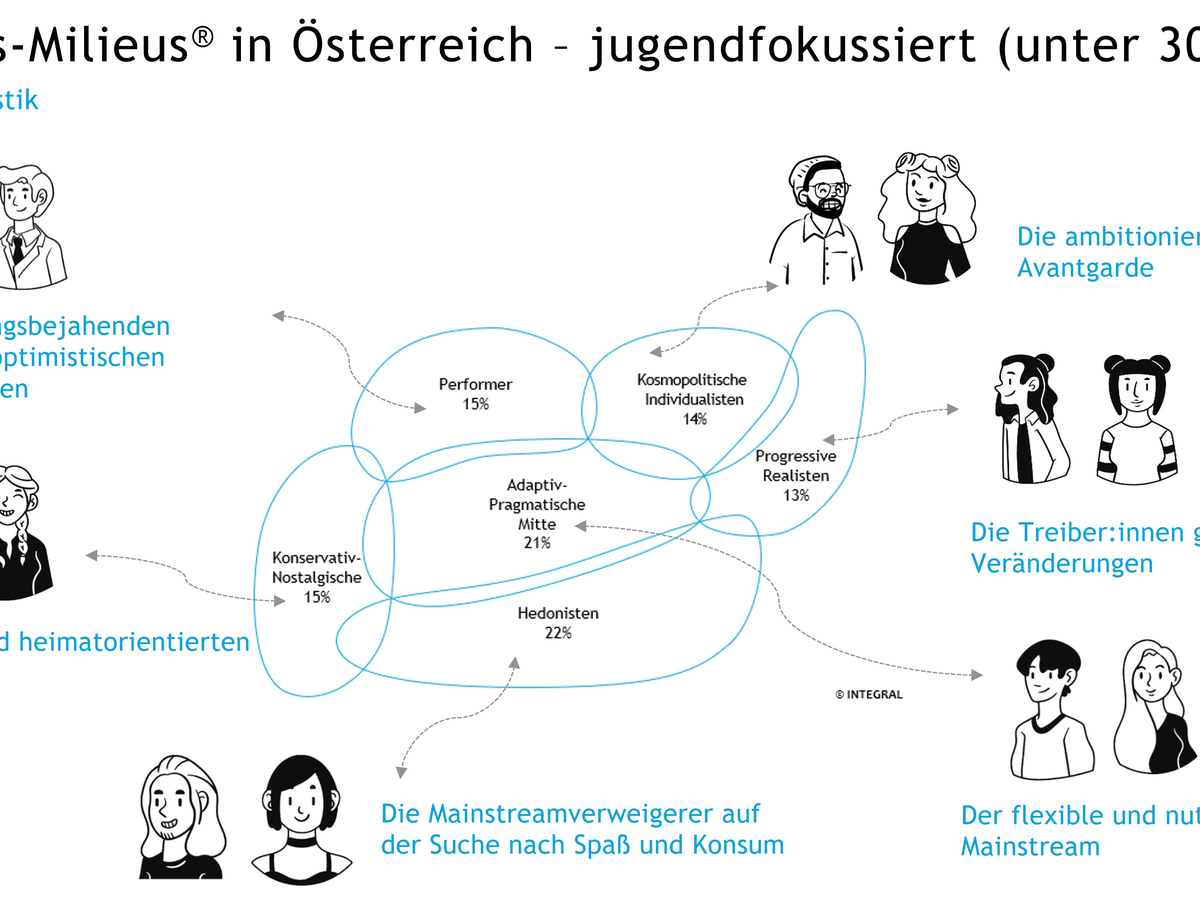 Wie zuversichtlich Jugendliche in die eigene Zukunft schauen, hängt maßgeblich von ihrer Lebenswelt ab. INTEGRAL hat sechs jugendliche Lebenswelten identifiziert und als Sinus-Jugendmilieus ( https://www.integral.co.at/sinus-milieus/sinus-jugendmilieus ) im Detail beschrieben. "Die leistungsorientierten Performer, die fortschrittsbejahend das eigene Glück gern selbst in die Hand nehmen, sind besonders positiv gestimmt: 93 % sehen eine rosige Zukunft. Deutlich düsterer fällt der Blick der Konservativ-Nostalgischen aus. Sie fühlen sich vielfach von der Gesellschaft allein gelassen, und nur 59 % von ihnen sehen ihre persönliche Zukunft positiv", erklärt Martin Mayr, Mitglied der Geschäftsführung bei INTEGRAL.